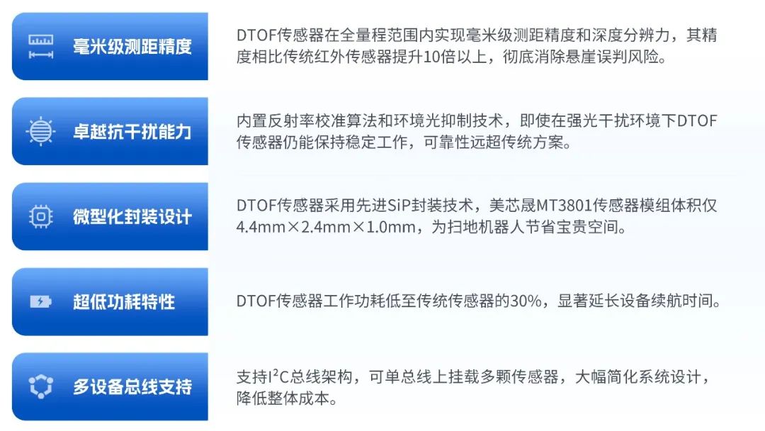 相較于傳統(tǒng)紅外和超聲波傳感器,DTOF(直接飛行時(shí)間)傳感器帶來(lái)了顯著的性能躍升,為掃地機(jī)器人提供了卓越的環(huán)境感知與避障能力,解決了長(zhǎng)期困擾掃地機(jī)器人行業(yè)的痛點(diǎn)問(wèn)題。