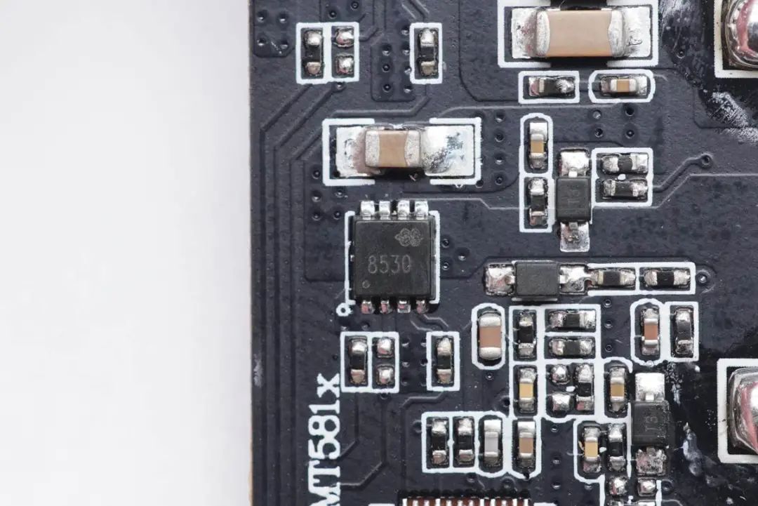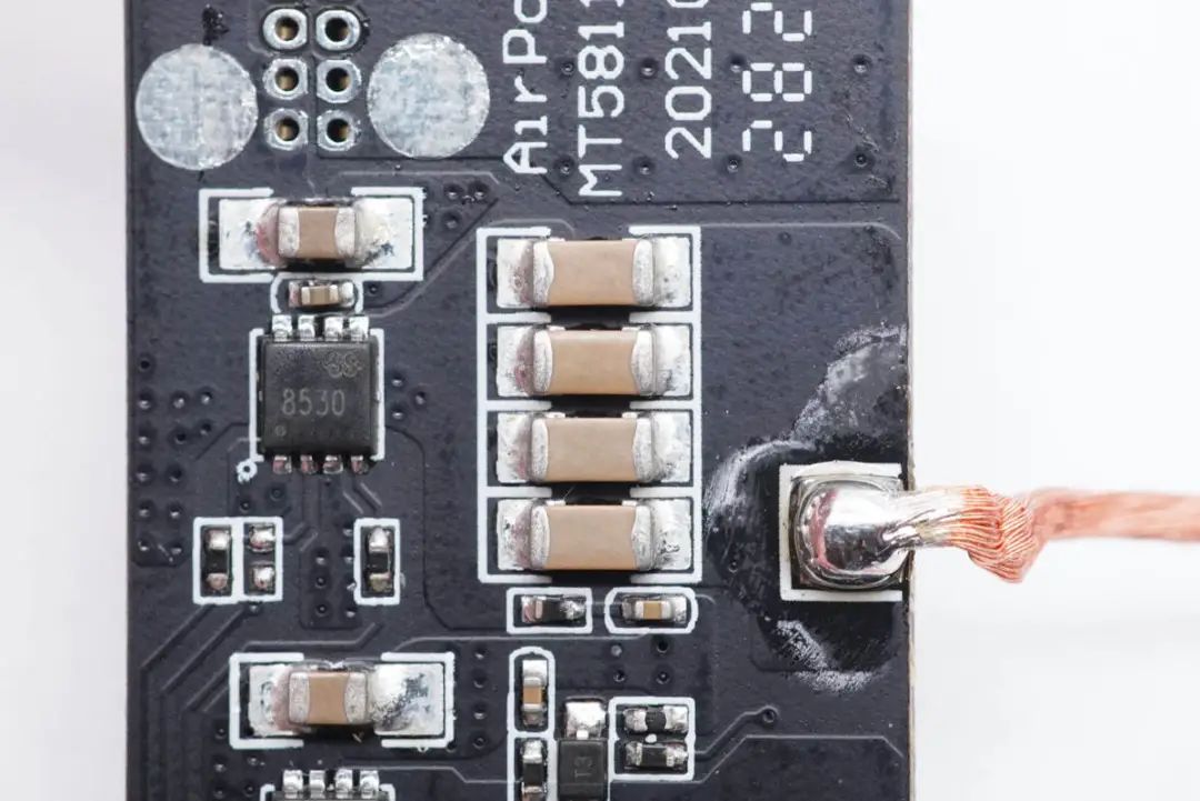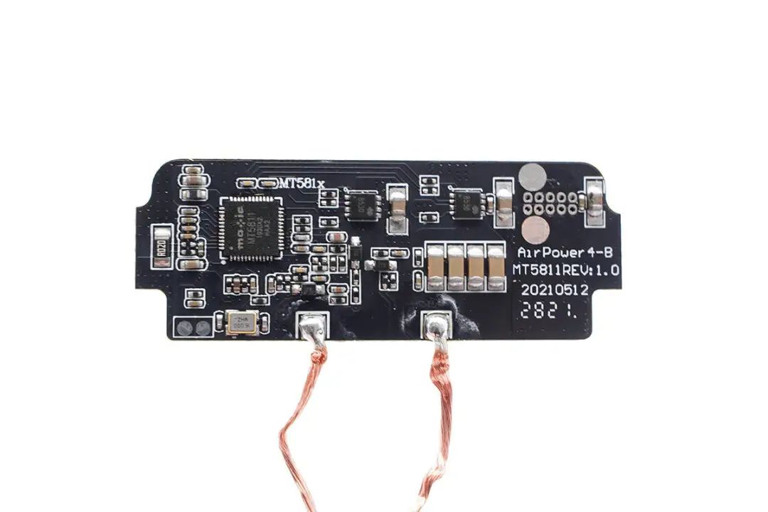 充電頭網(wǎng)通過拆解了解到,充電寶內(nèi)置兩塊PCB小板,之間有泡棉支撐。無線充方案采用美芯晟MT5811,這是一款高度集成的無線充電發(fā)射芯片,符合Qi標(biāo)準(zhǔn)以及高達15/50W的輸出功率,還集成ARM M0 處理器,總的來說在體積、兼容性、性能、效率等方面的表現(xiàn)都很好,能夠滿足客戶的各種要求。