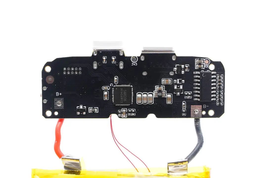 移動電源主控芯片采用智融SW6206。這是一款高集成度的多協(xié)議雙向快充移動電源專用多合一芯片,支持A+A+B+C+L口任意口快充。其集成了5A高效率開關(guān)充電,22.5W高效同步升壓輸出。