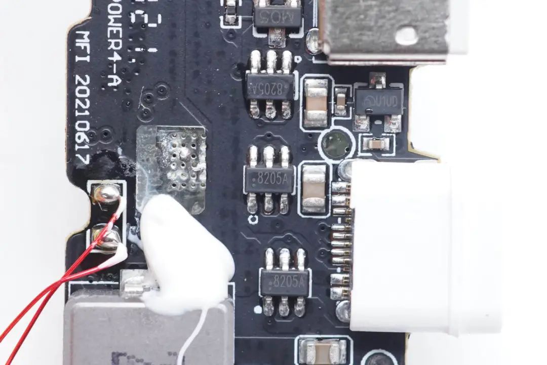 三顆絲印8205A的MOS管,用于接口保護。