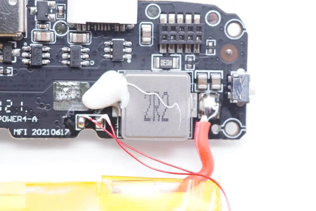 2R2升降壓電感特寫,打膠加固。