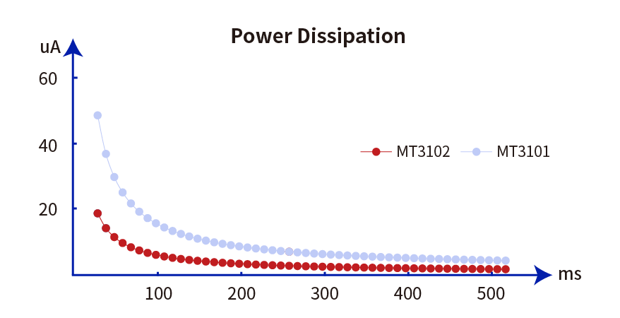 擁有業(yè)內領先的平均使用功耗水平,包含運行/待機/睡眠電流。其中,待機/休眠功耗0.7uA、工作電流低于10uA@100ms(包含VCSEL功耗)。MT3102功耗與前代MT3101相比大幅下降。