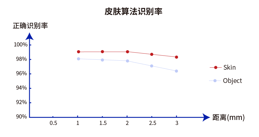 配有公司自研皮膚識別算法,在3mm距離下實現(xiàn)98%以上人體識別率,對于常規(guī)的非皮膚組織,如衣服(黑色/白色)、紙張(不同顏色)、桌面(木頭或金屬)、其他電子器件(塑料外殼)等物體實現(xiàn)95%以上識別率,有效提高可穿戴設備的佩戴檢測性能,提升用戶使用體驗。