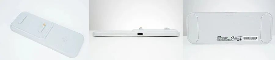 底座為扁平直板造型,四端以及邊緣過渡圓潤,表面啞光并有很多五顏六色小圓點(diǎn),使得底座整體看上去像花崗巖一般,右側(cè)凸起。無線充電區(qū)域設(shè)有十字膠墊,支持穩(wěn)定手機(jī)同時更好散熱。側(cè)面設(shè)有一個USB-A接口,黑色膠芯。底部兩側(cè)設(shè)有防滑膠墊,邊緣貼有產(chǎn)品銘牌貼紙。底座型號為SE-A61UW,支持12V1.5A輸入,USB-A輸出5V2A,無線充輸出最大10W,總輸出7.5W(無線充5W,USB-A口5V0.5A),產(chǎn)品通過了CE認(rèn)證。