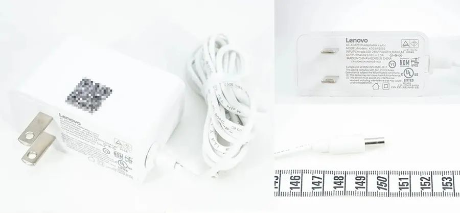 適配器采用PC材質(zhì)白色外殼,配備固定美規(guī)插腳,自帶DC圓頭輸出線纜。輸入端外殼印有適配器參數(shù),型號為AD18W2002,支持100-240V~50/60Hz 0.8A輸入以及12V1.5A輸出,通過了NOM、NYCE、UL、PSE認(rèn)證,以及VI級能效認(rèn)證。測得適配器輸出線纜長度約1.5米。