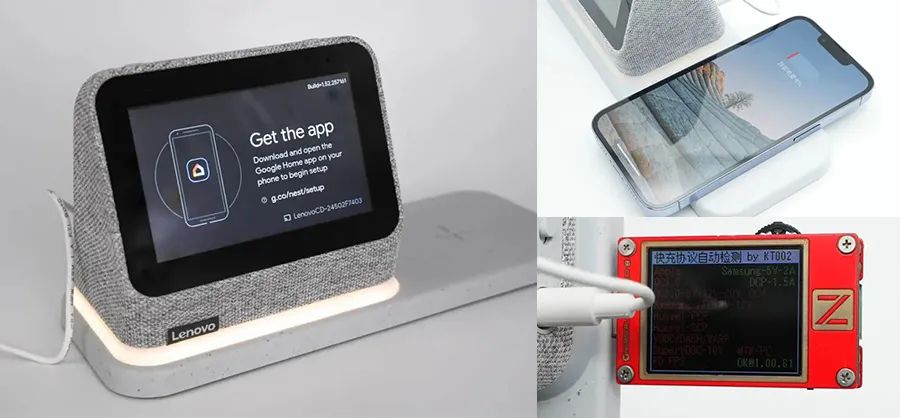 連接適配器并打開開關(guān),首先會出現(xiàn)一個讓用戶手機(jī)下載Google Home app的提示界面,即產(chǎn)品支持手機(jī)app智能控制,設(shè)置簡單方便。底座上的氛圍燈亮白光。同時可以將手機(jī)放在底座右側(cè)進(jìn)行無線充電,晚上入睡前為手機(jī)充電變得更加方便。使用ChargerLAB POWER-Z KT002測得USB-A口只支持Samsung 5V2A、DCP協(xié)議。