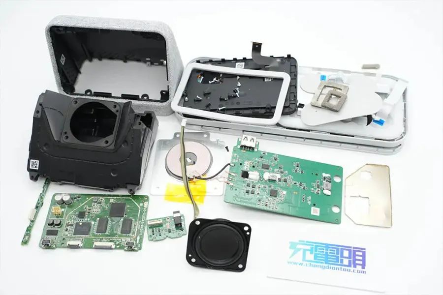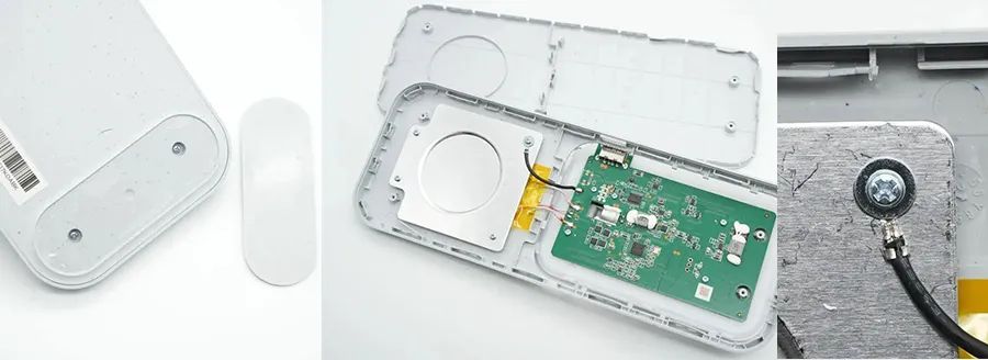 首先撕下底座兩側(cè)粘貼的防滑腳墊,固定螺絲隱藏在腳墊下面。拆開底座外殼,內(nèi)部是無線充電線圈和用于無線充電控制的PCBA模塊,無線充電線圈固定在散熱鋁板上,通過螺絲固定。接地導(dǎo)線也通過螺絲固定。