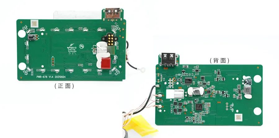 無線充電PCBA模塊正面特寫,邊緣為一圈LED燈,配合外殼上的導(dǎo)光條營造燈光效果。右側(cè)為連接時鐘的鍍金觸點(diǎn),用于為底座供電。無線充電PCBA模塊背面為一路完整的無線充電電路和用于USB降壓輸出供電的降壓電路。